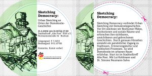 Sketching Democracy: 21.3.2026 von 15:30 bis 17:30 Stadtteiltreff „Alte Post“ IFAK e.V. Normannenstraße 34 Bochum Längengrad: E 7.19215 Breitengrad: N 51.47785 Kostenlos. Komm vorbei! Sketching Democracy verbindet Urban Sketching mit Demokratiegeschichte. Vor Ort zeichnen wir Bochumer Plätze, Institutionen und soziale Räume und erforschen ihre sichtbaren, unsichtbaren und gebrochenen Geschichten. Durch genaues Hinsehen entsteht ein persönlicher Zugang zu Stadtraum, Erinnerungskultur und politischen Prozessen. So wird Demokratie im urbanen Raum erfahrbar. Start ist im Stadtteiltreff Alte Post. Mit Lui Kohlmann und Dr.…