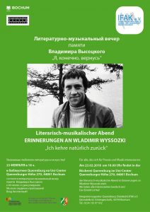 Für alle, die sich für Poesie und Musik interessieren. Am 23.02.2018 um 18.00 Uhr findet in der Bücherei Querenburg im Uni-Center Querenburger Höhe 270, 44801 Bochum der literarisch-musikalische Abend in Erinnerungen an Wladimir Wyssozki statt. Wir laden alle Interessierten herzlich ein! Der Eintritt ist frei!