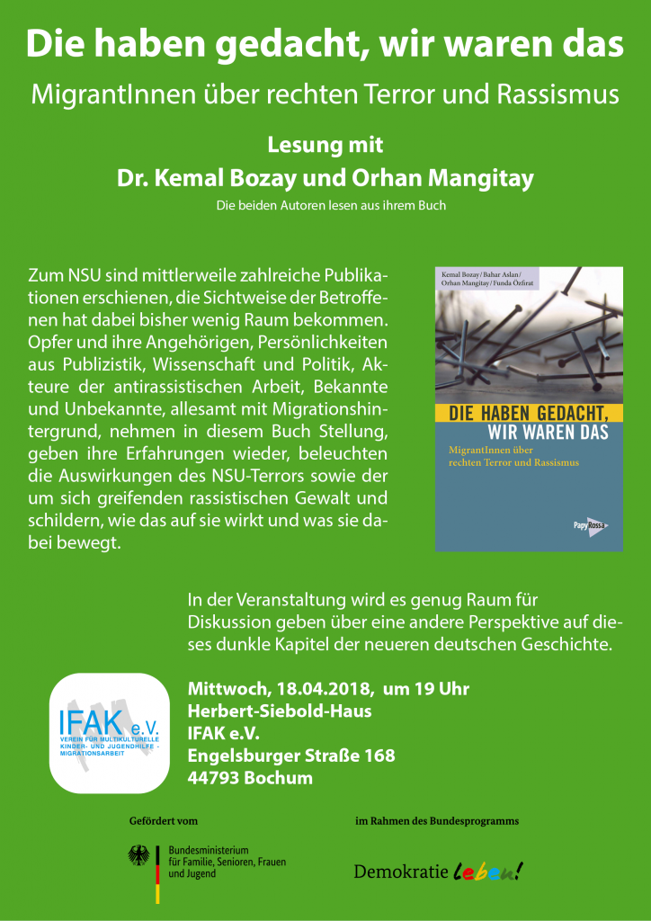 Lesung mit Dr. Kemal Bozay und Orhan Mangitay Die beiden Autoren lesen aus ihrem Buch "Die haben gedacht, wir waren das - MigrantInnen über rechten Terror und Rassismus" Zum NSU sind mittlerweile zahlreiche Publikationen erschienen, die Sichtweise der Betroffenen hat dabei bisher wenig Raum bekommen. Opfer und ihre Angehörigen, Persönlichkeiten aus Publizistik, Wissenschaft und Politik, Akteure der antirassistischen Arbeit, Bekannte und Unbekannte, allesamt mit Migrationshintergrund, nehmen in diesem Buch Stellung, geben ihre Erfahrungen wieder, beleuchten die Auswirkungen des NSU-Terrors sowie…