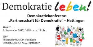 Partnerschaft für Demokratie Wir laden alle Interessierten herzlich ein zur Auftaktveranstaltung des gemeinsamen Projektes „Demokratie leben!“ in Hattingen. Es ist die erste Demokratiekonferenz in Hattingen und wir möchten sie nutzen, um über das Projekt zu informieren und zugleich einen Austausch über seine Ziele und Ausgestaltung sowie das Vorgehen in der nächsten Zeit zu ermöglichen. Folgender Ablauf ist bisher geplant: Begrüßung und Eröffnung durch den Bürgermeister Dirk Glaser Fachvortrag von Alexander Häusler (Sozialwissenschaftler HS Düsseldorf): „Rechtspopulismus in Deutschland: Ursachen und Gegenstrategien“…