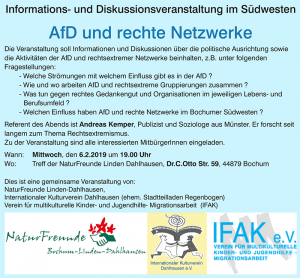 Gemeinsam mit den NaturFreunden Bochum-Linden-Dahlhausen und dem Internationalen Kulturverein Dahlhausen e.V. veranstalten wir am Mittwoch den 6.2.2019 einen Informations- und Diskussionsabend zum Thema "AfD und rechte Netzwerke" im Treff der NaturFreunde auf der Dr. C. Otto Str. 59 in 44879 Bochum