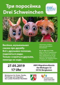 Unsere Theatergruppe „Märchenshow“ der Integrationsagentur Steinkuhl aus Bochum spielt auswärts! Wir laden wir Sie zur Puppentheateraufführung von „Die drei Schweinchen“ - "Три поросёнка" auf Russisch ein. Весёлая, музыкальная сказка про дружбу. Всё с друзьями пополам, поделиться рады. Только ссориться друзьям, никогда не надо.