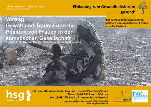 Einladung zum Gesundheitsforum "QUERgesund" Somalia ist seit drei Jahrzehnten ein Ort extremer Gewalt. Staatsterror, Bürgerkrieg und Krieg (auch der „Krieg gegen den Terrorismus“) haben ihre Spuren über Generationen hinterlassen. Hinzukommen oft traumatische Erfahrungen während der Flucht (im Land, in der Region, oder weltweit). Der Vortrag legt ein besonderes Augenmerk auf die Situation von Frauen in der somalischen Gesellschaft. Einerseits ist die Gesellschaft von traditionellen Normen und dem Islam geprägt. Dadurch wird Frauen eine eher untergeordnete Rolle zugewiesen. Andererseits bieten gerade…