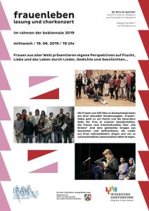 frauenleben: lesung und chorkonzert im Rahmen der Bobiennale. Die Frauen von NiD (Neu in Deutschland) lesen aus ihrer aktuellen Sonderausgabe „Frauen“. Dabei geht es um Macht und die besondere Rolle der Frau in unseren Gesellschaften. Die Frauen vom interkulturellen Chor „Die Brücke“ sind eine gemischte Gruppe aus Deutschen und Geflüchteten, die Lieder aus ihren Heimatländern singen und uns so unterschiedliche Lebenswelten näher bringen. Nach den Auftritten gibt es noch die Möglichkeit bei leckerem selbstgemachten Essen zusammen zu sitzen. Wir freuen…